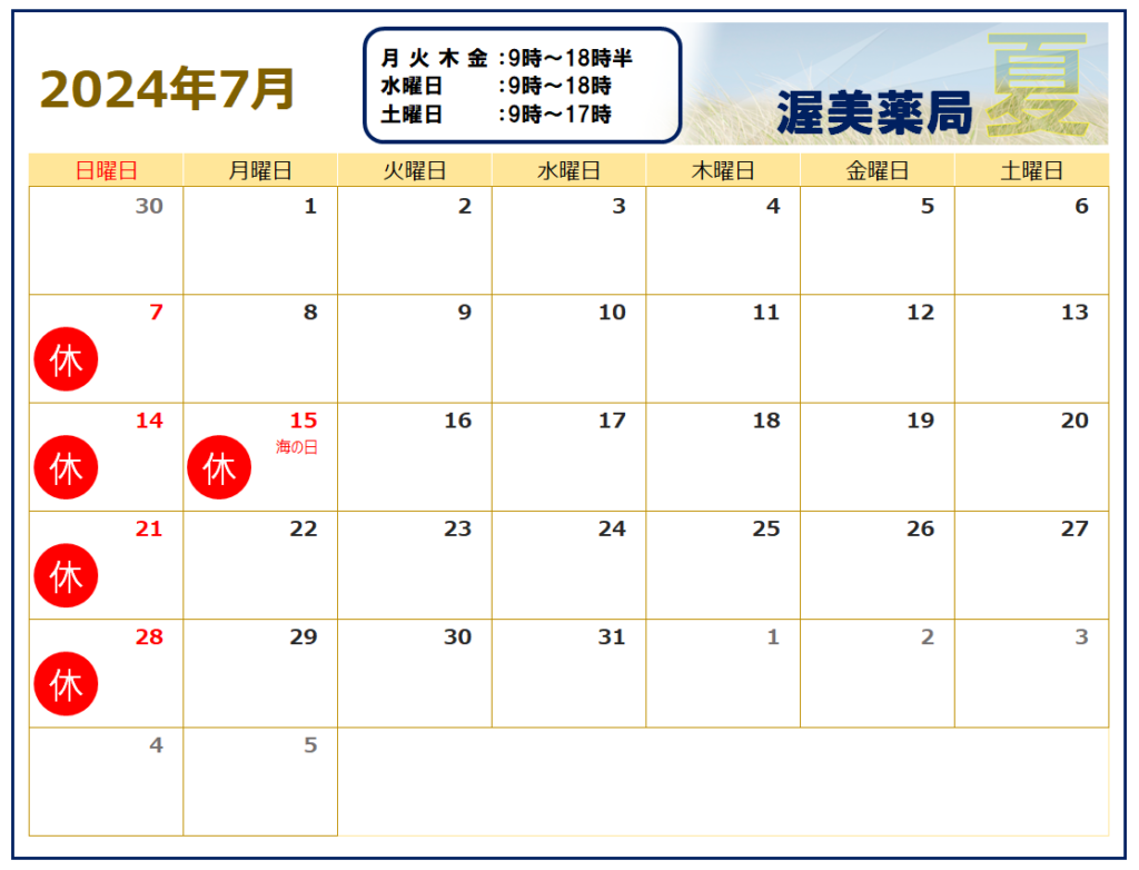 池町 調剤室の7月営業日と営業時間についてお知らせいたします。