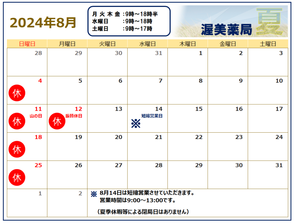 平素より渥美薬局をご利用いただき、誠にありがとうございます。池町 調剤室の8月営業日と営業時間についてお知らせいたします。8月12日(月)は祝日のため閉局日となっております。8月14日(水)は13時までの短縮営業とさせていただきます。 何卒よろしくお願いいたします。