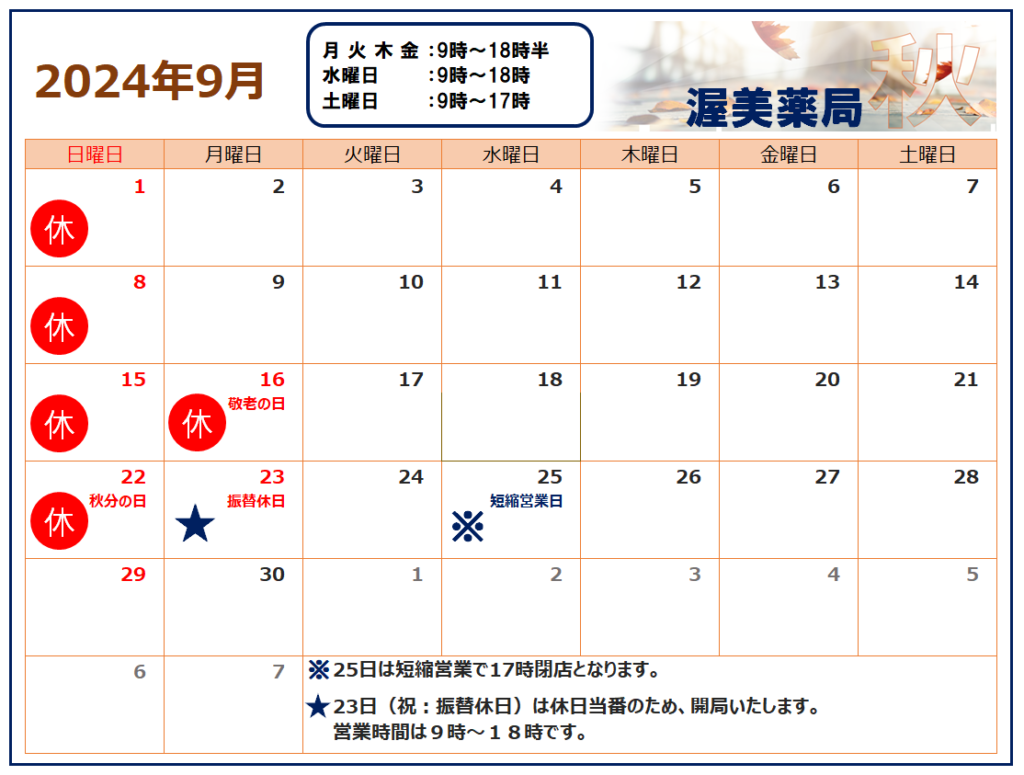 平素より渥美薬局をご利用いただき、誠にありがとうございます。池町 調剤室の9月営業日と営業時間についてお知らせいたします。9月16日(月)は祝日のため閉局日となっております。9月23日(月)は休日当番のため開局いたします。営業時間は9時~18時です。9月25日(水)は17時までの短縮営業とさせていただきます。 何卒よろしくお願いいたします。