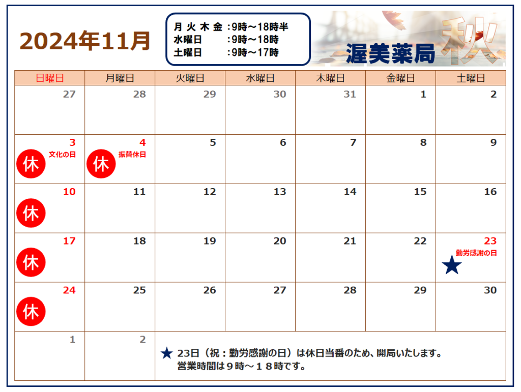(11/15追記)カレンダーが2025年のものとなっておりました。ご迷惑をおかけしてしまい、申し訳ございませんでした。平素より渥美薬局をご利用いただき、誠にありがとうございます。池町 調剤室の11月営業日と営業時間についてお知らせいたします。11月23日(土・祝、勤労感謝の日)は休日当番として営業日となっております。 何卒よろしくお願いいたします。