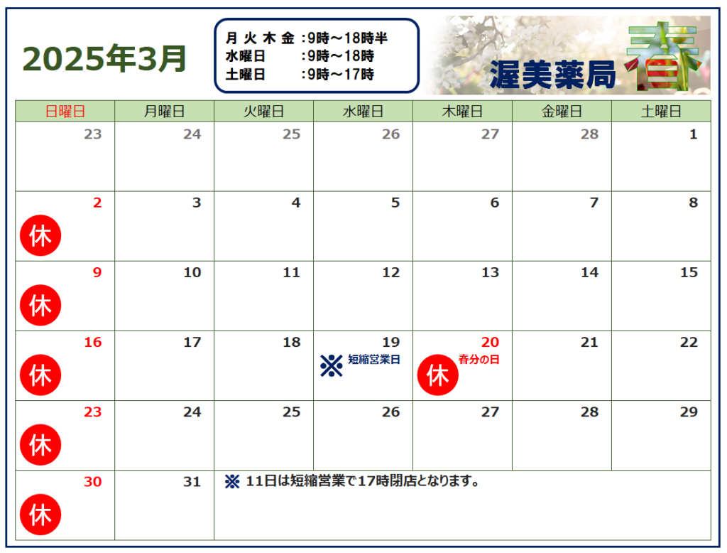 平素より渥美薬局をご利用いただき、誠にありがとうございます。池町 調剤室の3月営業日と営業時間についてお知らせいたします。3月19日(水)は17時までの短縮営業とさせていただきます。3月20日(木・春分の日)は祝日のため閉局日となっております。 何卒よろしくお願いいたします。