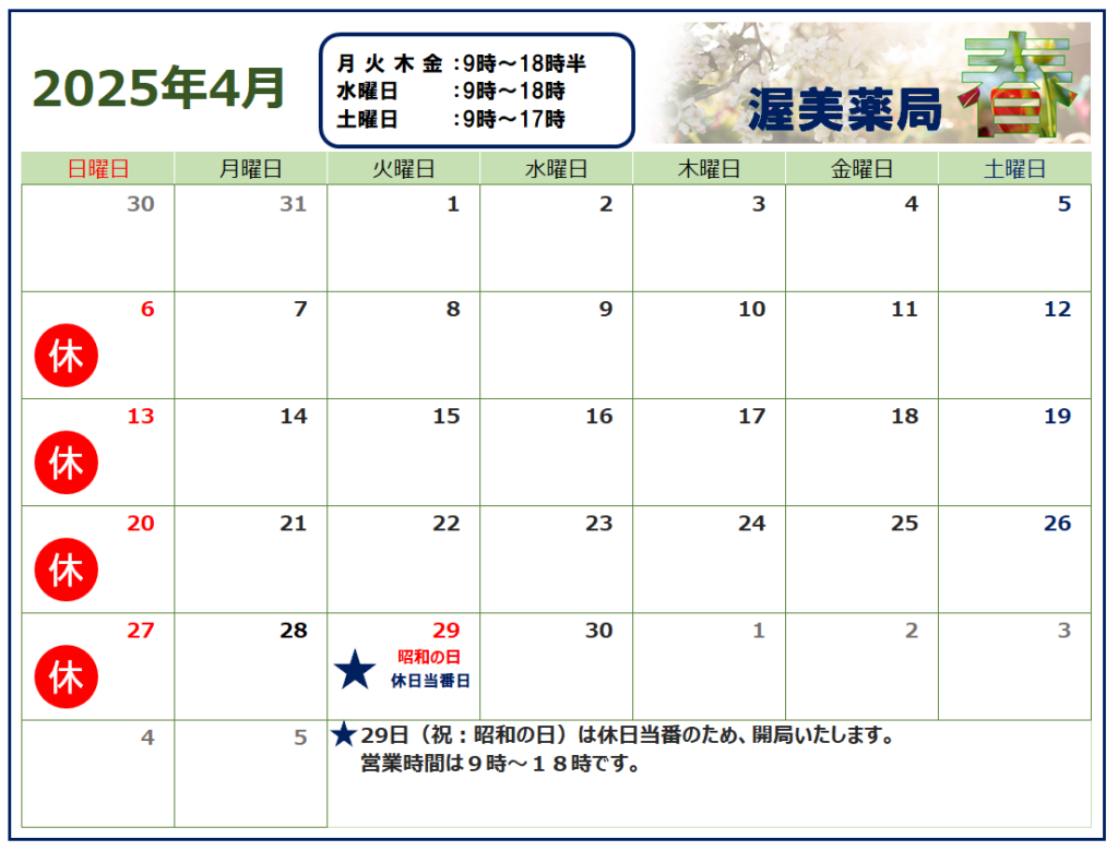 平素より渥美薬局をご利用いただき、誠にありがとうございます。池町 調剤室の4月営業日と営業時間についてお知らせいたします。4月29日(火・昭和の日)は休日当番のため、開局いたします。営業時間は9時~18時です。 何卒よろしくお願いいたします。