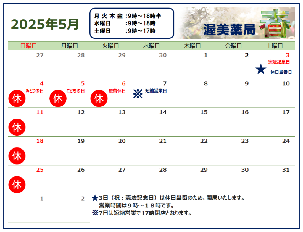 平素より渥美薬局をご利用いただき、誠にありがとうございます。池町 調剤室の5月営業日と営業時間についてお知らせいたします。5月3日(土・憲法記念日)は休日当番のため、開局いたします。営業時間は9時~18時です。5月7日(水)は17時までの短縮営業とさせていただきます。 何卒よろしくお願いいたします。