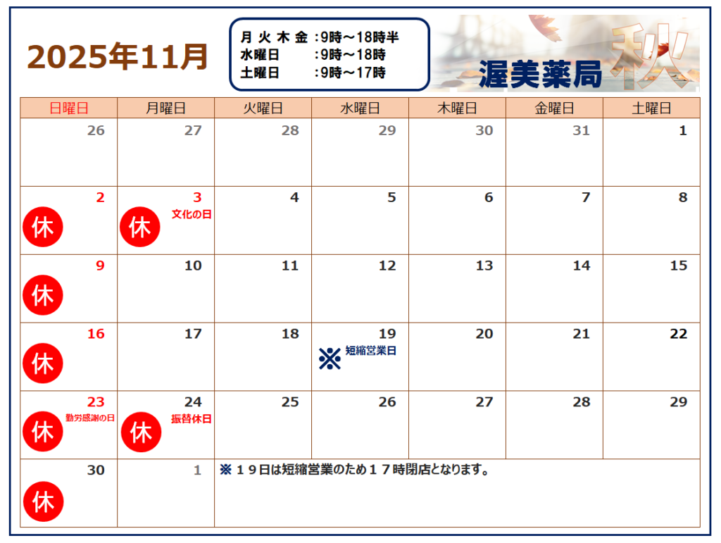 平素より渥美薬局をご利用いただき、誠にありがとうございます。池町 調剤室の11月営業日と営業時間についてお知らせいたします。11月19日(水)は17時までの短縮営業とさせていただきます。 何卒よろしくお願いいたします。