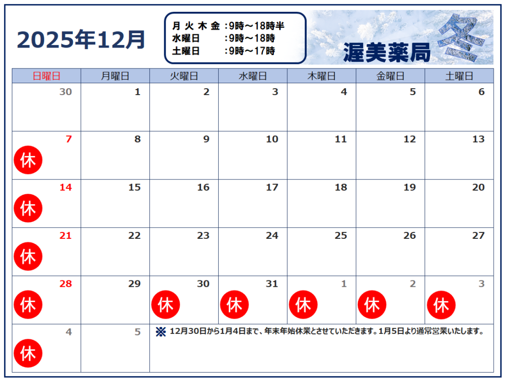平素より渥美薬局をご利用いただき、誠にありがとうございます。池町 調剤室の12月営業日と営業時間についてお知らせいたします。12月30日から1月4日まで年末年始休業とさせていただきます。 何卒よろしくお願いいたします。