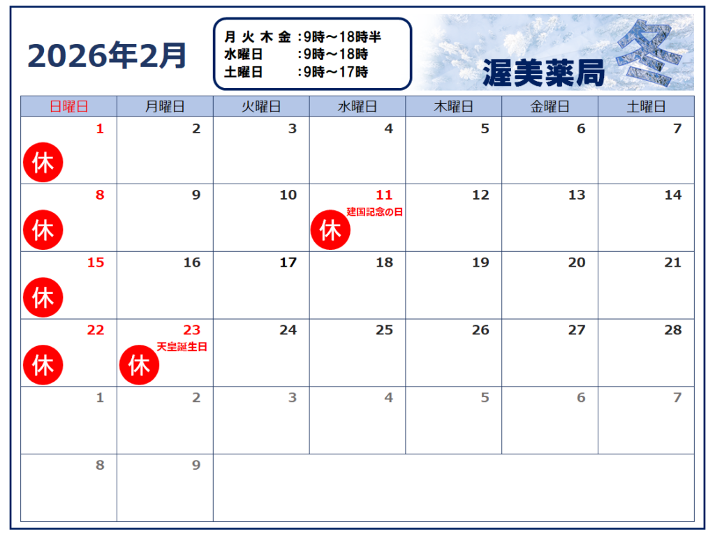 池町 調剤室の2月営業日と営業時間についてお知らせいたします。